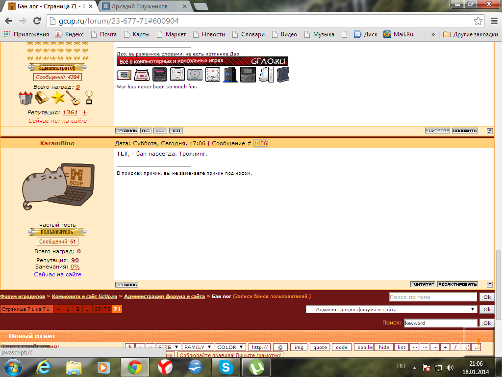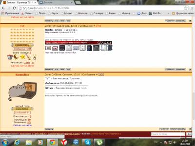 | Аркаша, я бы на твоем месте что-нибудь посмешнее придумал бы. Например: "бан за то, что утопил Му-Му" или "бан за пропаганду рыжизма"...